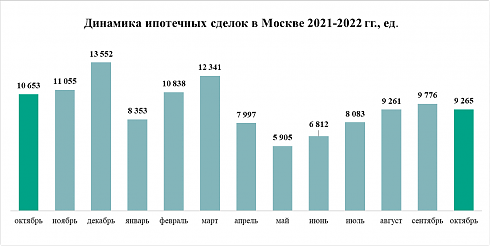 На рынке ипотеки тем временем спрос умеренно скорректировался. В октябре заемщики получили 9,3 тыс. кредитов на покупку нового и вторичного жилья, что на 5% меньше, чем в сентябре 2022. Относительно октября 2021 года количество сделок, зарегистрированных Росреестром Москвы в октябре 2022 года, оказалось на 13% ниже.