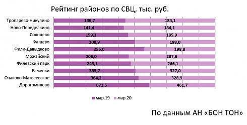 Тройку самых дорогих локаций составляют Раменки, Очаково-Матвеевское, Дорогомилово (в силу преобладания высокобюджетных сегментов). В районе Дорогомилово СВЦ достигает 461,7 тыс. рублей за кв.м, в Очаково-Матвеевском – 328,9 тыс. руб. за кв.м, в Раменках – 327 тыс. рублей за кв.м.