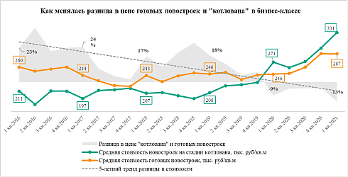 В 2020 году ситуация была неоднозначной. В I квартале разница была незначительной (1%), а во II квартале она резко возросла – цены на новостройки на котловане упали (со 173 до 149 тыс. руб. за кв.м за квартал из-за ощутимого прироста количества квартир на начальном этапе в 1,7 раза до 5 тыс. штук), из-за чего готовые новостройки оказались на 18% дороже. В последний раз такие стоимостные различия наблюдались только в 2016 году. Впрочем, в последующие кварталы новостройки на стадии котлована начали быстро дорожать, и готовое жилье оказалось дороже квартир в корпусах нулевого цикла в I квартале 2021 только на 9%. Так или иначе тренд показателя нисходящий.