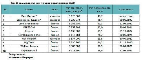 Вместе с тем в округе представлены предложения квартир и апартаментов стоимостью менее 10 млн рублей. Сегодня в СЗАО жилье продается в 23 проектах, апартаменты – в 7 проектах. В десятку комплексов с самыми бюджетными лотами вошли три проекта комфорт-класса и семь проектов бизнес-класса.