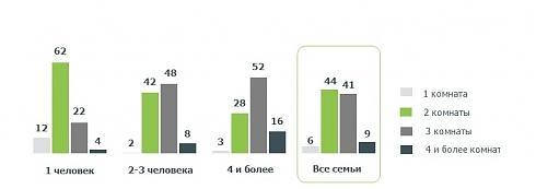 Согласно исследованию, 9% опрошенных рассматривают квартиры с четырьмя и более комнатами. О желании приобрести однокомнатное жильё заявили лишь 6% респондентов.