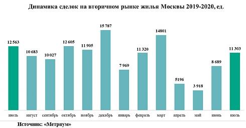 На вторичном рынке жилья в июле 2020 года спрос восстанавливался еще интенсивнее. В этот период в Москве заключили 11,3 тыс. договоров купли-продажи жилья, что на 30% больше, чем в июне 2020 года. В годовом выражении число сделок в июле 2020 года сократилось, но уже не на 21%, как в июне, а только на 10%. Таким образом, активность покупателей вторичного жилья также приближается к уровню прошлого года.
