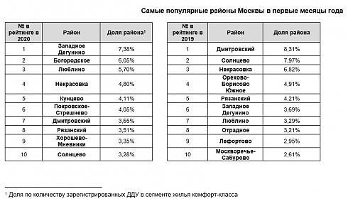 В январе и феврале 2020 года наибольшее число покупателей «комфортного» жилья выбирало новостройки в районе Западное Дегунино – на него приходится 372 сделки или 7,38% зарегистрированных ДДУ в сегменте комфорт. Высокие показатели отмечены также в районах Богородское и Люблино – 305 и 287 ДДУ (6,05% и 5,70% соответственно). Для сравнения – в прошлом году в тройку лидеров входили Дмитровский, Солнцево и Некрасовка.