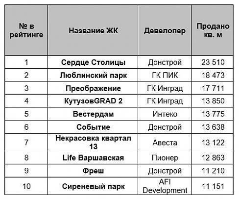 Самыми популярными новостройками Москвы стали ЖК «Сердце Столицы» от Донстрой и «Люблинский парк» от компании ГК ПИК – в них было реализовано 23, 5 тыс. кв. м и 18,4 тыс. кв. м жилых площадей соответственно. На третьем месте микрорайон «Преображение» от ГК Инград - в нем продано более 17,7 тыс. кв. м жилья.