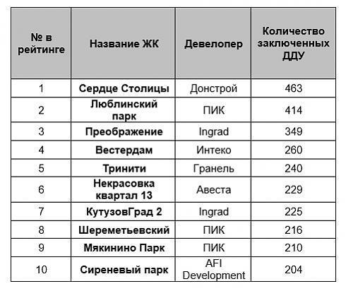 По количеству договоров долевого участия тройка лидеров осталась неизменной: в ЖК «Сердце Столицы» было зарегистрировано 463 штуки, на проект «Люблинский парк» приходится – 414 договоров, а в ЖК «Преображение», было заключено 349 договоров.
