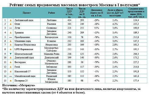 В рейтинге наиболее успешных проектов произошли радикальные изменения. Прежний бессменный лидер – жилой комплекс «Некрасовка» (район Некрасовка) – выбыл из списка, уступив место жилому комплексу «Люблинский парк» (Люблино), где было продано 5% от общего числа реализованных массовых квартир в Москве в I полугодии. В среднем с января по июнь каждый месяц в этом комплексе застройщик продавал по 118 квартир. Однако во II квартале число заключенных ДДУ в этом проекте уменьшилось относительно предыдущего периода на 30%.