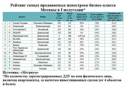 Самым продаваемым жилым комплексом бизнес-класса в I полугодии 2020 года в Москве стал ЖК «Сердце Столицы» (Хорошёво-Мнёвники). На долю этого проекта пришлось 7,8% от всех зарегистрированных в I полугодии ДДУ в бизнес-классе. В среднем с января по июнь каждый месяц в «Сердце Столицы» застройщик продавал по 103 квартиры. Однако во II квартале число заключенных ДДУ в этом проекте уменьшилось относительно I квартала на 62%.