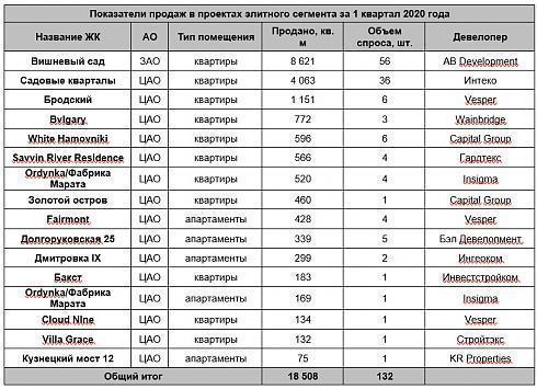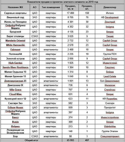 За 2019 год среди проектов элитного сегмента было зарегистрировано почти 500 ДДУ или 66 тыс. кв. м. Самым популярным стал комплекс «Садовые Кварталы» от ГК Интеко, в нем было реализовано более 17 тыс. кв. м жилья, это 150 договоров долевого участия. Клиенты также отдавали предпочтение также ЖК «Вишневый Сад» - в нем продано 8,7 тыс. кв. м (76 ДДУ) и ЖК «Жизнь на Плющихе», в котором показатели составляют 4,3 тыс. кв. м (30 ДДУ). В пятерку лидеров также вошли проекты Ordynka и ЖК «Бродский», которые аналогично лидерам показали отличные темпы реализации, а также отличаются высоким качеством строительства и уровнем жизни.