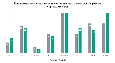 В мае 2021 года в Северном административном округе (САО) Москвы застройщики реализовывали 19 проектов массовых новостроек, тогда как год назад их было 14. По текущему числу ЖК САО потеснил постоянного лидера московского девелопмента экономичных комплексов – Юго-Восточный административный округ (ЮВАО), где реализуют 19 проектов, хотя этот показатель не изменился.