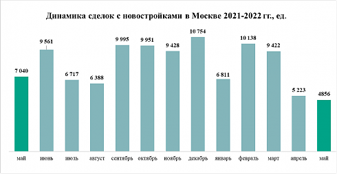 По сравнению с апрелем 2022 года, когда было заключено 5,2 тыс. ДДУ, майское число сделок ниже на 7%, тогда как в апреле спрос на новостройки в Москве относительно марта обвалился на 45%.