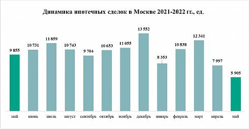 На рынке ипотеки наблюдалась другая динамика. В мае заемщики получили почти 5,9 тыс. кредитов на покупку нового и вторичного жилья, тогда как в мае 2021 года Росреестр Москвы зафиксировал почти 9,9 тыс. ипотечных сделок. Таким образом, в годовом измерении спрос на кредит упал на 40%. Для сравнения: в апреле в столице заключили на 38% меньше сделок, чем в апреле 2021 года