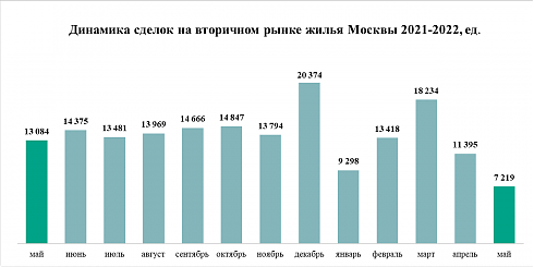 Самый резкий спад зафиксирован на вторичном рынке жилья в Москве. В мае зарегистрировано 7,3 тыс. договоров купли-продажи вторичных квартир, а также жилья в готовых новостройках, что на 45% меньше, чем в мае 2021 года, и на 37% меньше, чем в апреле 2022 года.