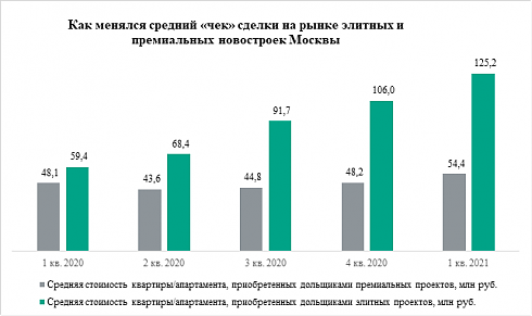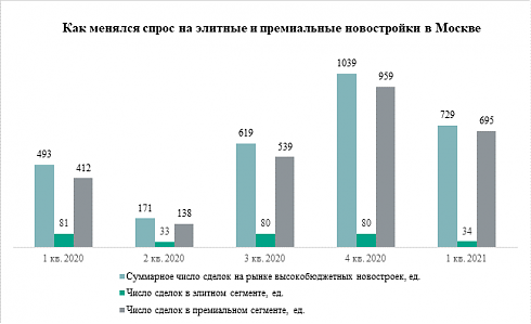 По сравнению с аналогичным периодом 2020 года спрос на дорогие новостройки Москвы увеличился на 48%. В I квартале 2020 года покупатели заключили 493 сделки, из которых 412 относились к премиальному сегменту, а 81 – к элитному. Хотя спрос на элитные новостройки таким образом сейчас заметно сократился, в премиум-классе покупатели были более активны, чем год назад.