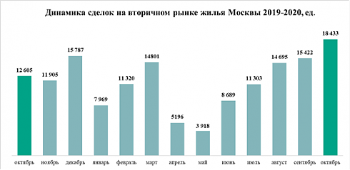 На вторичном рынке жилья в октябре 2020 года спрос также стал рекордным. В Москве заключили 18,43 тыс. договоров купли-продажи жилья, что на 46% больше, чем в октябре 2019 года, и на 20% больше, чем в сентябре 2020. Октябрьский показатель – также рекордный. Последний пик был достигнут в декабре 2013 года, когда было зарегистрировано 18,39 тыс. сделок купли-продажи в Москве.