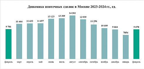 Количество ипотечных сделок в феврале 2024 года в Москве между тем увеличилось. Заемщики получили в банках на покупку первичного и вторичного жилья 9,7 тыс. кредитов, что на 23% больше, чем в январе 2024 года, когда было зарегистрировано 7,9 тыс. ипотечных сделок. Февральский показатель 2024 года уступает только на 1% результату такого же месяца 2023 года (9,8 тыс. ипотек). Текущий показатель один из самых высоких в истории наблюдений наряду с 2022 годом (10,8 тыс.) и 2023 (9,8 тыс.).