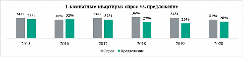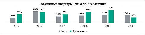 Второй формат жилья, спрос на который превышает предложение, – однокомнатные квартиры. В 2020 году доля сделок с этим типом квартир на московском рынке новостроек составила 31%, тогда как их удельный вес в предложении составил 28%. На протяжении последних спрос превышал предложения на однокомнатные квартиры. С 2015 года – на 2 процентных пункта, в 2016 году – доля сделок была меньше доли предложения на 1 п.п., а в 2017 году спрос вновь превысил предложения – на 2 п.п., в 2018 и 2019 – на 9 п.п.