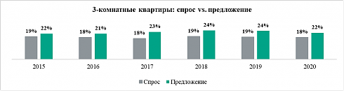 Стабильно выше предложение трехкомнатных квартир. В 2020 году на их долю пришлось 18% сделок против 22% от общего числа квартир в продаже. Доля предложения трехкомнатных квартир стабильно превышает спрос на 3-5 процентных пунктов. Схожая ситуация и на рынке многокомнатных квартир, на долю которых пришлось 3% сделок, хотя они образуют 5% квартир в продаже.