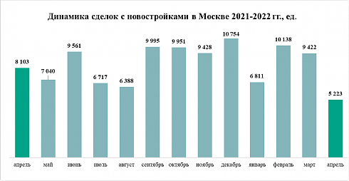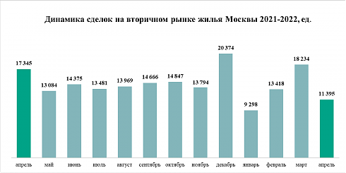 На вторичном рынке также зафиксирован резкий спад числа сделок. По данным Росреестра Москвы, в апреле покупатели вторичных квартир, а также жилья в готовых новостройках, заключили 11,4 тыс. договоров купли-продажи, что на 34% меньше, чем в апреле 2021 года, и на 38% меньше, чем в марте 2022 года.