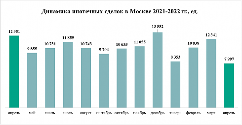 По сравнению с предыдущим месяцем, мартом, когда было зарегистрировано 12,3 тыс. ипотечных сделок, спрос на жилищные кредиты сократился в Москве на 35%. Апрельский показатель – худший за прошедшие 14 месяцев с января 2021 года (когда было заключено немногим менее 6 тыс. ипотечных сделок).