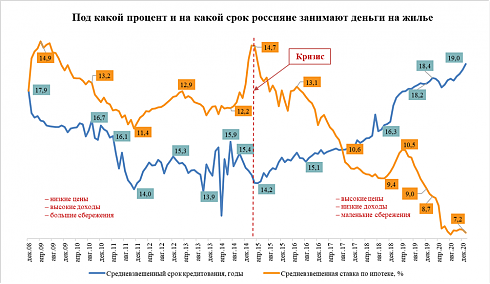 Различие в трендах объясняется принципиальными изменениями, произошедшими в экономике России в 2014-2015 гг. После кризиса 2008 года ситуация быстро стабилизировалась. Доходы населения были сравнительно высокими, что позволяло накапливать на первоначальный взнос для получения ипотеки 30-40% стоимости жилья. При этом ставки по кредитам, несмотря на их высокий уровень, снижались, поэтому заемщики предпочитали сокращать срок кредитования, чтобы быстрее выплатить кредит и снизить переплату.