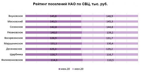 За счет улучшения транспортной доступности в этих поселениях средняя цена квадратного метра демонстрирует рост. В поселении Внуковское средняя цена квадрата составила 148,9 тыс. руб., которая по сравнению с уровнем июня выросла на 2,1%, а за год - на 18,7%. Это на 3% больше, чем в целом по рынку Новой Москвы.