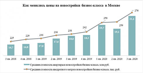 В Москве средняя стоимость квартиры в новых жилых комплексах бизнес-класса впервые превысила 20 млн рублей, подсчитали аналитики компании «Метриум». За последние три месяца этот показатель вырос на 10%, а с начала года – на 16%. При этом в III квартале резко сократилось предложение новостроек бизнес-сегмента, достигнув уровня 2016 года.