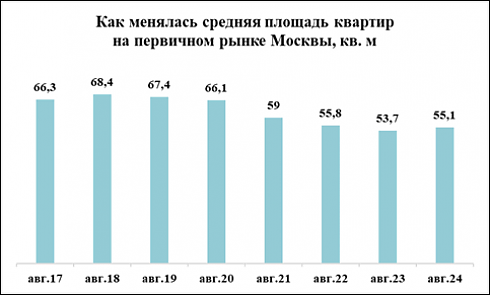 По данным «Метриум», средняя площадь квартир на первичном рынке столицы (включая Новую Москву) сейчас составляет 55,1 кв. м. За год показатель вырос на 2,6%. В августе 2023 года он был равен 53,7 кв. м.