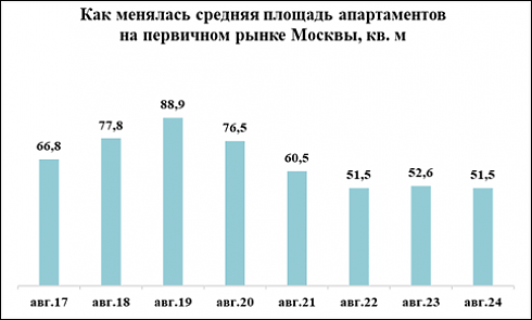 Аналитики «Метриум» подсчитали, что средняя площадь апартаментов на первичном рынке столицы сейчас составляет 51,5 кв. м. За прошедшие 12 месяцев она сократилась на 2,1%. Год назад показатель был равен 52,6 кв. м.