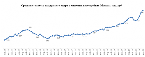 В ноябре средняя стоимость квадратного метра в проектах новостроек массового сегмента в Москве достигла 203 тыс. рублей за квадратный метр. По сравнению октябрем она увеличилась на 2,3%, с началом года – на 16%, с ноябрем 2019 года – на 17%.
