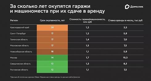 Окупаемость гаражей и машиномест при их сдаче в аренду составляет 17 лет в Санкт-Петербурге и 14 лет в Москве. Разницу в сроках можно объяснить значительными различиями в арендных ставках: в Москве они на 79,1% выше, чем в Санкт-Петербурге. Хотя стоимость купленных объектов в Москве также больше цен в Северной столице, этот разрыв несколько ниже – 46,4%.