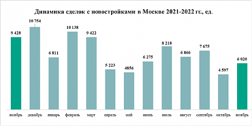 В ноябре покупатели квартир в строящихся домах, по данным Росреестра Москвы, заключили в Москве 6 тыс. договоров долевого участия, что на 31% больше, чем в октябре, когда было зарегистрировано 4,6 тыс. ДДУ. Таким образом, московским девелоперам удалось несколько отыграть октябрьское падение спроса, которое стало следствием мобилизации и других факторов. Однако спрос все ещё остается ниже среднемесячного значения в 2022 году (около 7 тыс. ДДУ).