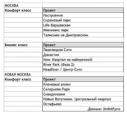 В сегменте комфорт-класса на территории старой Москвы в ТОП-5 вошли комплексы «Настроение», «Сиреневый парк», «Life-Варшавская», «Мякинино Парк» и «Талисман на Дмитровском». В комфорт-классе Новой Москвы в лидерах оказались «Кленовые аллеи», «Саларьево Парк», «Скандинавия», «Новые Ватутинки. Центральный квартал» и «Остафьево».