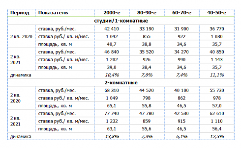 Наибольший рост ставок отмечен по квартирам в современных домах, построенных после 2000 года. Однокомнатные квартиры в таких объектах в июне 2021 года в среднем предлагались в аренду за 46,8 тысячи рублей (+10% в годовой динамике), двухкомнатные — за 77,7 тысячи рублей(+14%). Для сравнения, ставки аренды квартир в домах типовой застройки выросли на 6-7%.