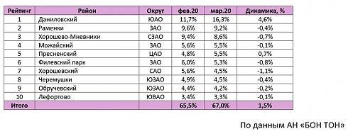 Согласно статистике АН «БОН ТОН», районы из ТОП-10 в бизнес-классе концентрируют 67% предложения. При этом наибольшая концентрация отмечается в трех локациях – районах Даниловский (16,3%), Раменки (9,2%), Хорошево-Мневники (8,6%). Заметный прирост за месяц показал Даниловский район, экспозиции стало больше на 30,8%, а доля увеличилась с 11,7% до 16,3%. Остальные районы из ТОП-10, кроме Пресненского, показали сокращение доли.