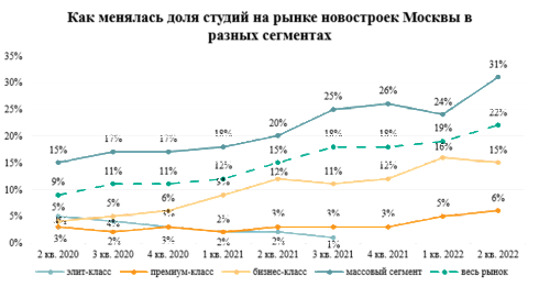Наибольшая доля студий продается в новостройках эконом- и комфорт-класса Москвы (включая комплексы апартаментов). В июле 2022 года в этом сегменте рынка продавали 6,6 тыс. студий против 3 тыс. в аналогичный период 2020 года. Их доля в предложении возросла с 15% до 31%, то есть почти каждая третья квартира или апартамент в продаже в массовых новостройках Москвы – студия.