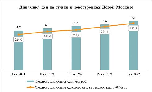 Средняя стоимость студий в новостройках Новой Москвы в I квартале 2022 года превысила 7 млн рублей, подсчитали эксперты компании «Метриум». За три месяца цена студий увеличилась более чем на 500 тыс. рублей, а квадратный метр в таком типе квартир в среднем подорожал до 295 тыс. рублей. При этом площадь студий за I квартал кардинально не изменилась.