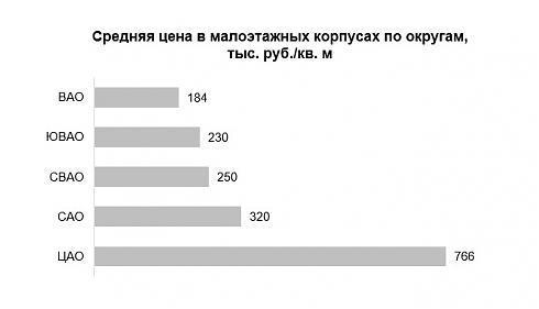 В ЦАО апартаменты занимают 88% предложения данного формата, при этом средняя цена составляет 766 тыс. руб./кв. м. Высокий показатель зафиксирован также в САО – 320 тыс. руб./кв. м, а в СВАО и ЮВАО стоимость кв. м практически на одном уровне – 250 тыс. рублей и 230 тыс. рублей соответственно. Самые бюджетные малоэтажные корпуса находятся в ВАО, там средняя цена составляет 184 тыс. руб./кв. м.