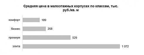 Средняя цена в комфорт-классе составляет 189 тыс. руб./кв. м, в сегменте бизнес стоимость находится на уровне 258 тыс. руб./кв. м. В комплексах высоких сегментов традиционно высокие показатели – 529 тыс. руб./кв. м в премиум-классе и 1, 07 млн руб./кв. м в элитном сегменте.
