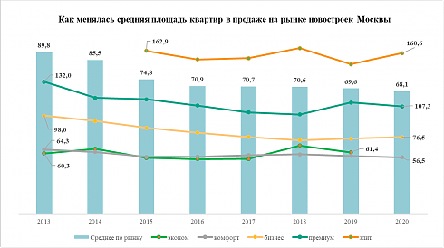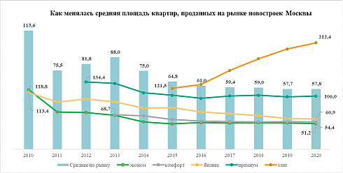 В последнее десятилетие на московском рынке новостроек клиенты были склонны приобретать квартиры всё меньшей площади. Исключением стал только элитный сегмент, где наблюдалась обратная тенденция – средняя площадь приобретённой квартиры увеличивалась.