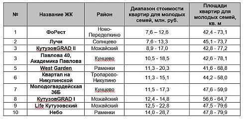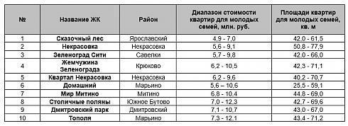 Специалисты компании Est-a-Tet выделили 10 новостроек, которые соответствуют необходимым параметрам и отлично подойдут для молодых семей. Например, ЖК «Сказочный лес», в котором стоимость лотов площадью от 42 до 61,5 кв. м варьируется от 4,9 до 7 млн рублей. Проект «Некрасовка», не смотря на неблагополучную экологическую обстановку района, пользуются большой популярностью у молодежи за счет низких бюджетов, развитой инфраструктуре и возможностью получения московской регистрации. В данном комплексе квартиры площадью от 50,8 до 77,9 кв. м стоят здесь 5,6 – 9,1 млн рублей. В рейтинге также представлено несколько проектов, расположенных в Зеленограде, в микрорайонах с развитой инфраструктурой, это комплексы «Зеленоград Сити» и «Жемчужина Зеленограда», в которых цены на просторные квартиры варьируются от 5,7 до 10,5 млн рублей. Микрорайон «Домашний» от Группы ПСН расположен на берегу Москвы-реки, в составе проекта предусмотрено строительство собственных объектов социальной инфраструктуры, в том числе и детского сада на 190 мест. Лоты площадью от 25,5-59,1 кв. м можно приобрести в бюджете от 5,6 до 10,6 млн рублей.