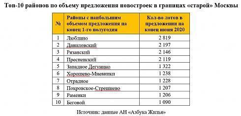 Департамент консалтинга и аналитики агентства недвижимости «Азбука Жилья» проанализировал объем предложения и продаж в сегменте новостроек в разрезе по районам «старой» Москвы и динамику за прошедшее полугодие. Рынок новостроек распределен по «старой» Москве не равномерно. Из общего количества в 125 районов на 15 районов приходится 21,7 тыс. лотов, что составляет более половины от всего объема предложения первичного жилого рынка столицы, а в 36 районах и новостроек в реализации нет.