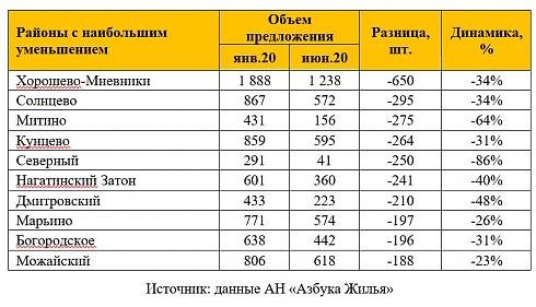По сравнению с началом 2020 года наибольшее снижение объема предложения отмечено в районах Хорошево-Мневники (уменьшение на 650 лотов), Солнцево (меньше на 295 лотов) и Митино (меньше на 275 лотов).