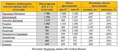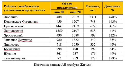 Наибольший рост объема предложения (квартир и апартаментов в продаже) за полгода отмечен в районе Люблино, в котором предложение возросло более чем на 2 тыс. лотов, в основном за счет ЖК «Люблинский парк» от ГК ПИК. Другими районы с большим увеличением предложения являются Покровское-Стрешнево (за счет комплексов «Сити Бэй», «Левел Стрешнево» и «Движение Тушино») и Пресненский (параллельно развиваются несколько крупных проектов бизнес-класса).