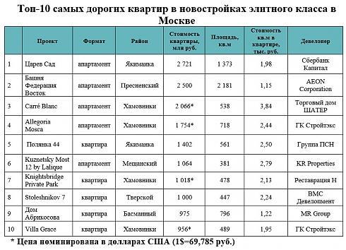По данным компании «Метриум», стоимость самой дорогой элитной квартиры в открытых продажах в Москве почти в 20 раз превышает среднюю стоимость объекта по этому сегменту столичного рынка новостроек. Квартира в комплексе апартаментов «Царев Сад» (район Якиманка) обойдется в 2,7 млрд рублей, тогда как средняя стоимость новой элитной квартиры в Москве составляет 136,9 млн рублей. Объект площадью 1 373 кв.м. реализуется по 1,98 млн рублей за кв.м. в жилом комплексе, девелопером которого выступает «Сбербанк Капитал».