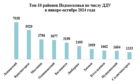 Ленинский городской округ лидирует по числу сделок на рынке новостроек Подмосковья. С начала 2024 года здесь заключено 7038 договоров долевого участия, что составляет 19% от общего объема спроса на новостройки в Московской области. То есть каждую пятую квартиру в новостройках Подмосковья в 2024 году приобретают в Ленинском округе. Относительно аналогичного периода 2023 года число сделок сократилось на 32,8%.