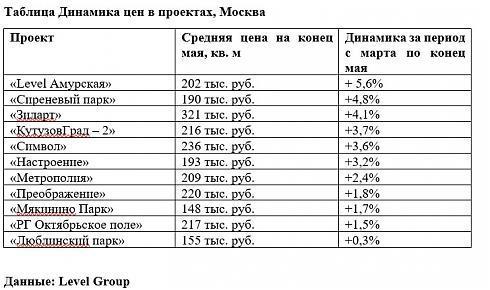 Лидерами прироста цен за период март-май стали проекты «Level Амурская», «Сиреневый парк» и «Зиларт».