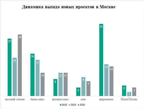 В 2020 году на рынке новостроек Большой Москвы начались продажи 76 комплексов с квартирами и апартаментами. В 2019 году девелоперы дали старт реализации 72 проектов, а в 2018 году – 98 проектов. Таким образом, в 2020 году застройщики смогли нарастить темп выхода в продажу новых объектов, несмотря на локдаун, девальвацию рубля и временное падение спроса. В ушедшем году новых проектов было на 6% больше, чем в 2019 году, но всё же на 22% меньше, чем в 2018 году.