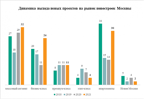 Количество новых проектов застройки элитного сегмента на московском рынке в 2021 году сократилось по сравнению с предыдущим годом. В 2021 году застройщики предложили покупателям только четыре новых проекта против семи в 2020 году и девяти – в 2019 году. Впрочем, в активном 2018 году в продаже появилось тоже только четыре элитные новинки.