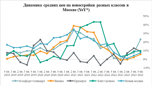В целом средняя стоимость московских новостроек (во всех сегментах и на локальных рынках) за 2023 год выросла с 404 тыс. рублей до 451 тыс. рублей за квадратный метр, то есть на 12%. Для сравнения: в 2022 году этот показатель увеличился только на 4%. Таким образом, темпы роста цены в 2023 году выросли по сравнению с 2022 годом.