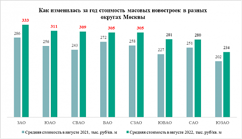 Самым дорогим округом на рынке массовых новостроек по-прежнему остается Западный АО, где средняя стоимость квадратного метра в августе достигла 333 тыс. рублей, что на 16% больше, чем 12 месяцев назад.